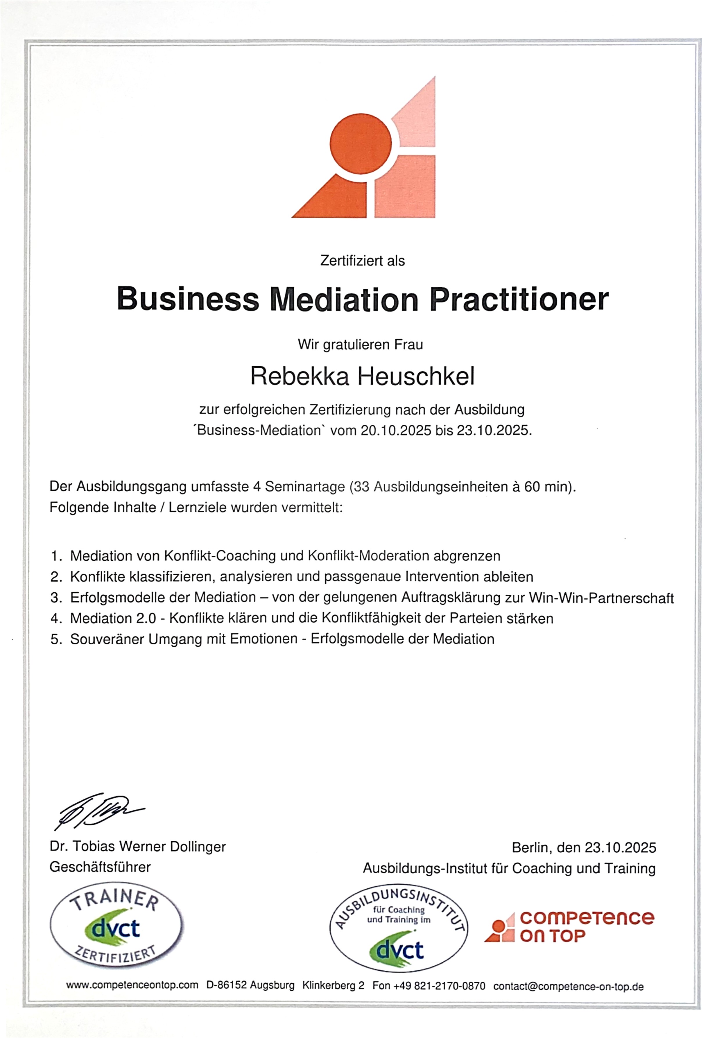 Als Team aus Expert:innen begleiten wir Unternehmen mit maßgeschneiderten Lösungen in Personal- und Organisationsfragen. Unser Ziel ist es, Zusammenarbeit zu stärken, Führungskräfte zu entlasten und Konflikte nachhaltig zu lösen. Wir unterstützen Organisationen sich zukunftsfähig auszurichten, Mitarbeitende zu motivieren und ein Arbeitsumfeld zu schaffen, in dem Leistung und Zufriedenheit Hand in Hand gehen.